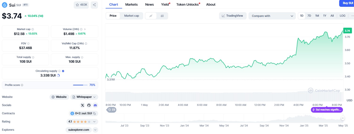 Solana, another top-10 cryptocurrency by market cap, has also reclaimed levels above $150, contributing to renewed enthusiasm for smaller tokens like SUI and SEI.